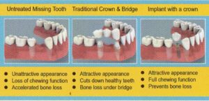 Traditional treatment options for tooth replacement such as crowns, bridges and full or partial dentures, address the short-term cosmetic problem of missing teeth, but do nothing to stop bone loss. Crown & Bridge also requires that two or more healthy teeth be ground down to serve as abutments (posts) for a bridge, leaving them at a much greater risk for cavities and endodontic failure. If the original abutment teeth fail, more healthy teeth must be sacrificed to serve as posts, while you continue to lose bone beneath the bridge. With implants, however, the healthy teeth are left alone. Dental implants, like natural teeth, also transmit chewing forces to the jawbone, which reduces bone loss. This is why many leading dental organizations now recognize dental implants as the standard of care for tooth replacement.